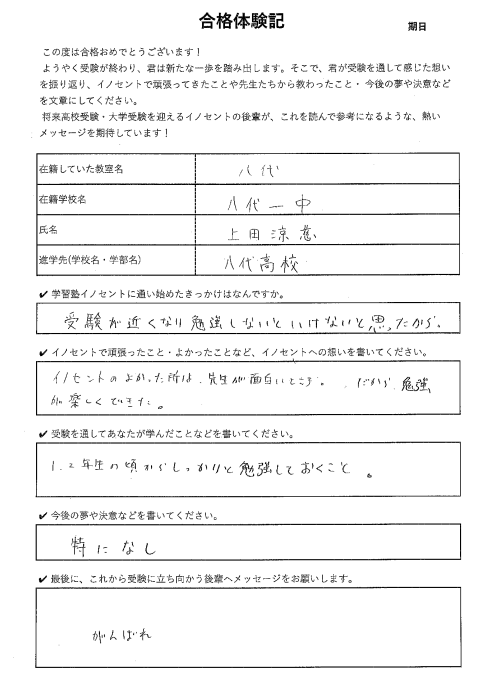 学習塾 イノセント ブログ 八代教室 八代一中から八代高校に合格!~合格体験記~ 八代一中から八代高校に合格!~合格体験記~ 八代教室 2024年3月27日 八代第一中から見事八代高校に合格! 中3から通い始めてくれましたが、楽しみながら塾に通ってくれ、成果に繋げてくれて合格まで導いてくれました!おめでとう!! 前の記事へ 一覧に戻る 次の記事へ 関連記事 まだ“本気の自分”に出会っていないなら、今だ。 “合格”は、準備した人にしか微笑まない 10月28日、29日に各中学校で中学3年... 八代教室熊本県 2025年10月3日 📈 成績アップの秘訣② 一人で勉強するのと、友人と勉強するのはどっちが良い?! こんにちは!学習塾イノセント八代教室です🌱 勉強をしていると、ふ... 八代教室模試 2025年10月1日 定期テスト、大幅点数アップ! 点数大幅アップ 速報! (※順次更新) 今回の定期テストでも多くのみなさんが点数... 八代教室 2025年9月21日 八代教室の普段の様子♪ 八代教室の普段の様子♪ 八代教室では、自習スペースを完備していますので、いつでも... 八代教室 2025年9月19日 八代で塾を探すなら?|イノセント学習塾八代教室 八代エリアで塾を探している方へ 圧倒的な実績を出しているイノセント学習塾八代教室... 八代教室 2025年9月12日 国立大学合格地域1番目指してます😊 国立大学合格率、合格者数地域1番を目指してます😊 ... 八代教室合格実績 2025年9月4日