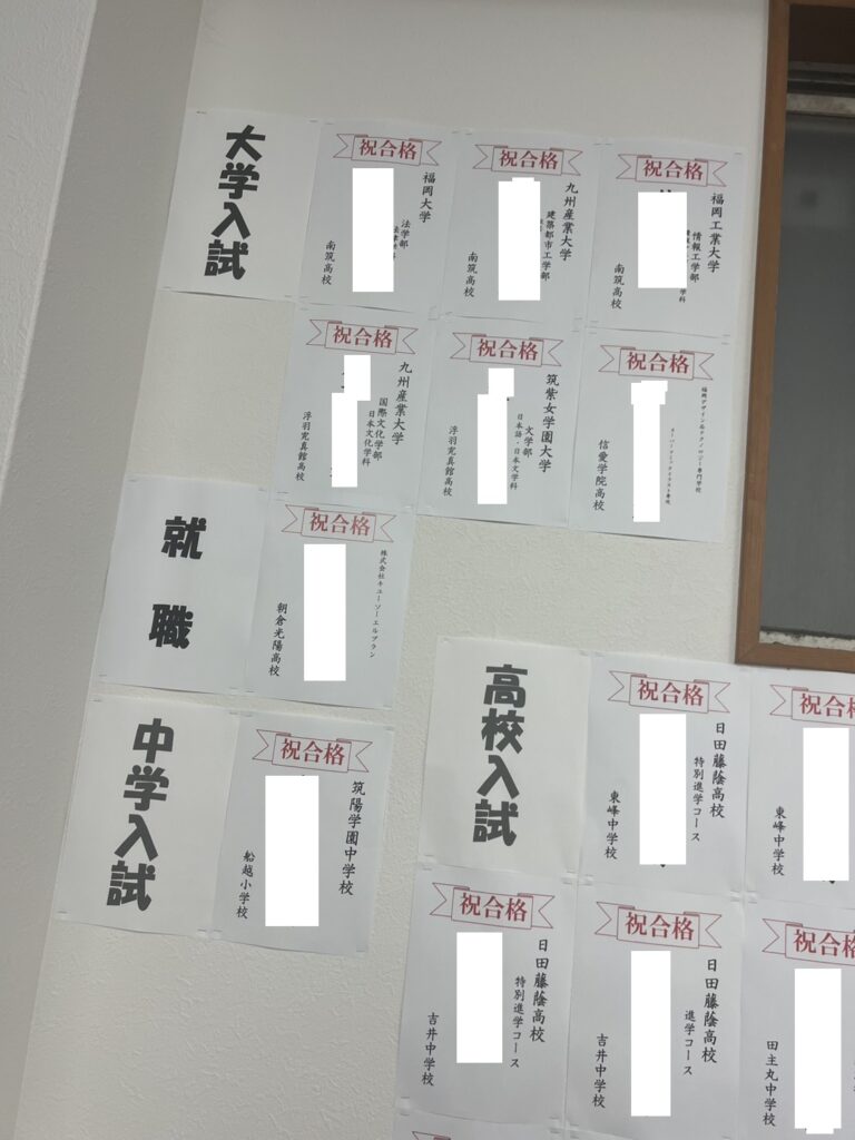 学習塾 イノセント ブログ 田主丸教室 田主丸教室2025年度合格実績のご紹介~!! 田主丸教室2025年度合格実績のご紹介~!! 田主丸教室合格実績合格体験記中学入試高校入試大学入試 2026年3月27日 久留米市田主丸町、うきは市吉井町、浮羽町、朝倉市のみなさんこんにちは! 今年の受験生よく頑張ってくれました!個別指導の学習塾イノセント田主丸教室の上田です。 記事の内容合格実績のご紹介まずは大学入試!続いて中学入試!最後に高校入試!新年度受講生募集中! 合格実績のご紹介 まずは大学入試! まずは高校3年生の今回の結果です!福岡大学 法学部 法律学科九州産業大学 国際文化学部 日本文化学科九州産業大学 建築都市工学部 住居・インテリア学科福岡工業大学 情報工学部 情報マネジメント学科筑紫女学園大学 文学部 日本語・日本文学科みんなおめでとう!! 続いて中学入試! 今年は1名だけですが見事第一志望の学校に合格しました!筑陽学園中学校合格おめでとう!合格体験記はこちら!🌺筑陽学園中合格体験記 最後に高校入試! 最後に中学3年生の結果です!今年は田主丸教室史上最多の中学3年生が在籍しておりました!その数なんと46名!地域一番の中学3年生がいる個別指導塾になれたのではないかと確信しております。それでは結果をご報告します!朝倉高校久留米高校久留米商業高校朝倉東高校筑水高校浮羽究真館高校朝倉光陽高校浮羽工業高校陸上自衛隊高等工科学校博多女子高校日田藤蔭高校昭和学園高校祐誠高校信愛学院高校久留米学園高校みんなおめでとう! 新年度受講生募集中! 新年度田主丸教室一緒に勉強頑張りたい!テストで最高得点をとりたい!ライバルに差をつけたい! そんな皆さんを待ってます!小中学生だけではありません! もちろん高校生も!田主丸教室には一緒に勉強を頑張る高校生が4/1現在で3学年 35名在籍しています。高校生になったからこそ高校生だからこそ学習塾イノセント!みなさんのお問合せお気軽にお待ちしております! ✨体験授業のお申込みはこちら✨ 前の記事へ 一覧に戻る 次の記事へ 関連記事 後期試験合格! 後期試験まで粘ってくれた子達が見事に合格を果たしてくれました✨ 素... 八代教室大学入試 2026年3月27日 2026九州大学合格体験記 九州大学 医学部 保健学科 看護学専攻 合格! 学習塾イノセントに通い始めたきっ... 合格体験記 2026年3月27日 2026熊本大学合格体験記 熊本大学 教育学部 合格! 学習塾イノセントに通い始めたきっかけは? 以前通って... 合格体験記 2026年3月27日 2026鹿児島大学工学部合格体験記 鹿児島大学 工学部 合格! 学習塾イノセントに通い始めたきっかけは? 中学3年生... 合格体験記 2026年3月27日 2026鹿児島大学合格体験記 鹿児島大学 医学部 保健学科 看護学専攻 合格! 学習塾イノセントに通い始めたき... 合格体験記 2026年3月27日 2026日本文理大学合格体験記 日本文理大学 工学部 情報メディア学科 合格! 学習塾イノセントに通い始めたきっ... 合格体験記大学入試 2026年3月27日