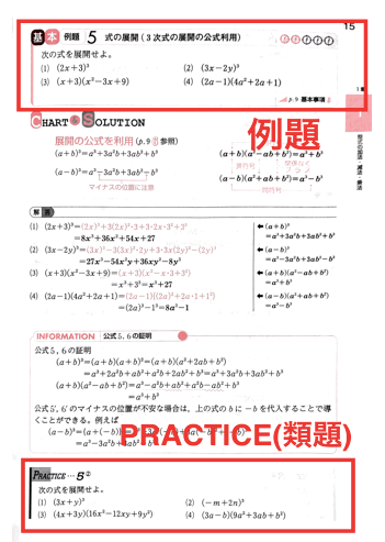 画像のように、各例題の下にPRACTICE(類題)が掲載されていますが、基本的にはここの部分は解かなくても良いですよ!!絶対に解くなと言っているわけではないので、解きたい人は是非解いたほうが良いですよ(^^♪